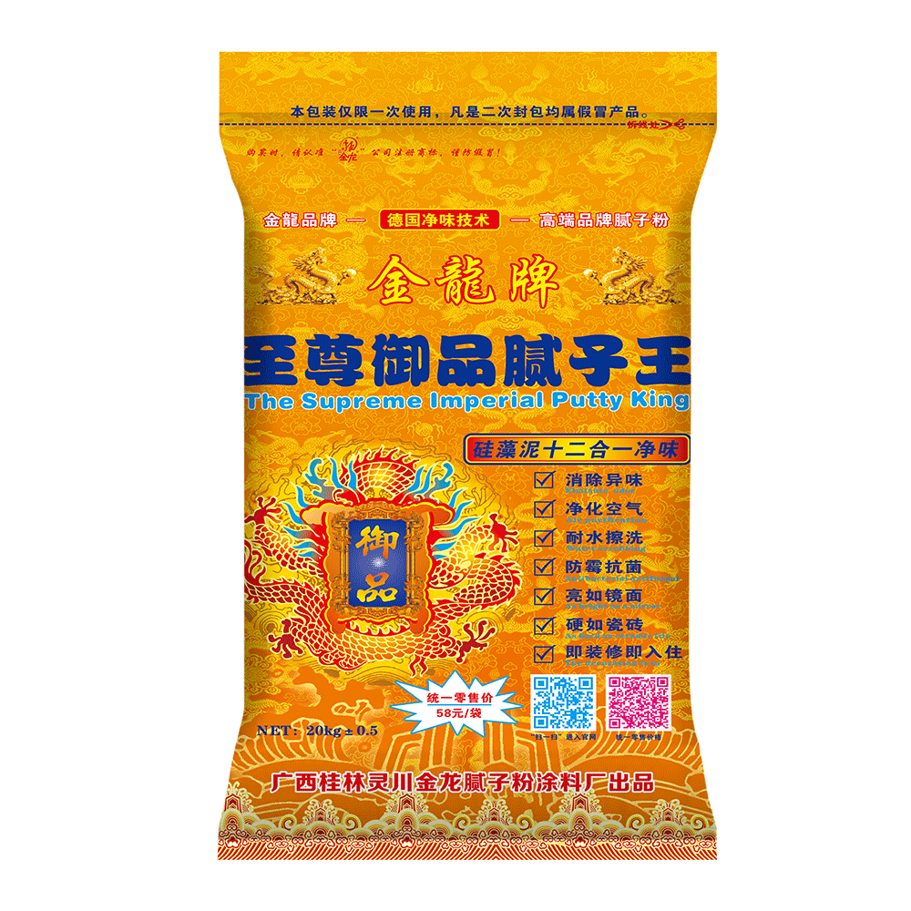 金龙至尊御品腻子王,专为顶级名宅赋予金贵气质,成就家居装修艺术的巅峰设计,尊贵品质,王者风范。精选超白超细超亮双飞粉及多种高纯度进口原材料,特有进口纳米抛光材料和高分子保水剂,抛光之后,亮如镜面,硬如瓷砖,划不留痕,品质卓越,技术领先,采用全新竹炭净味技术,蕴含天然竹炭活性因子,能持续释放负离子,有效净化分解空气中甲醛、笨、氨等有害物质,消除异味。特有毛细管吸收调节功能,对室内空气进行调节,保持室内相对湿度,增强人的舒适度,有效呵护家人身体健康。超强防潮防霉功能,能有效抵抗墙面细菌滋生,防止发黑,霉变。特有驱虫功效,能驱除微小有害虫类。超强耐水功能,水洗万遍无变化,全效净醛,至尊品质,真正符合“即装修”“即入住”高标准愿望。使用寿命长达30年以上。是您营造健康环保家居装修首选产品。